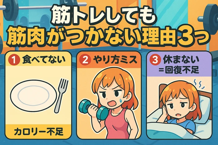 - 筋肉がつかない三大原因は「カロリー不足・誤ったトレーニング・休養不足」