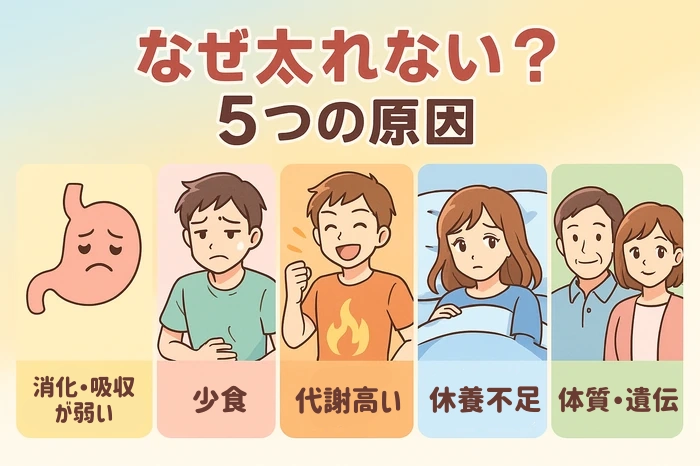 - 太れない理由は「消化吸収の弱さ・少食・高代謝・ストレス・体質」などが複合的に関係